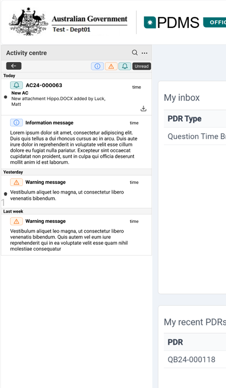 PDMS UI UPLIFT: ACTIVITY CENTRE